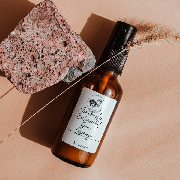 Our Minerally Enhanced Sea Spray is a multi-purpose mist for both hair and skin, crafted with mineral-rich pink Himalayan salt, Dead Sea salt, magnesium chloride, witch hazel, and apple cider vinegar. It’s infused with a refreshing, earthy blend of basil, sage, cucumber, mint, and frankincense essential oils.